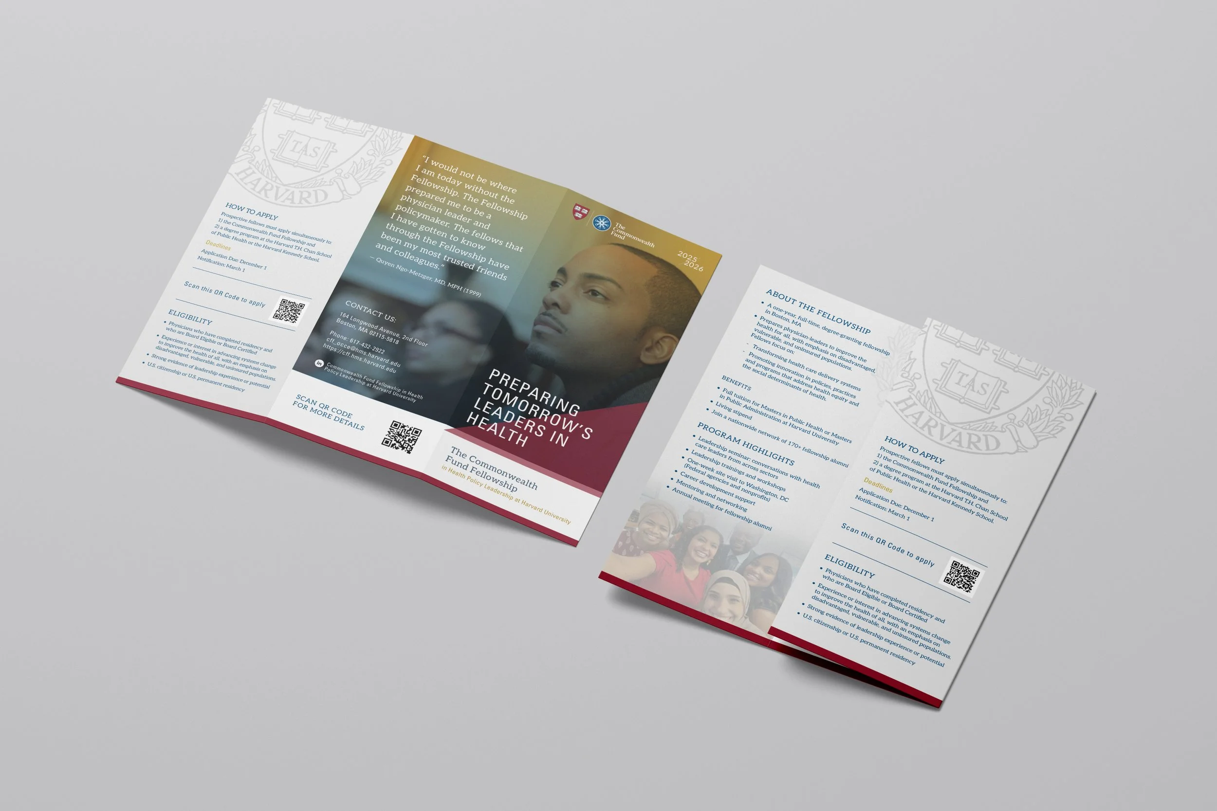 At Harvard Medical School, the Office of Culture and Community Engagement supports programs that strengthen medicine through mentorship, community, and leadership. The Commonwealth Fund Fellowship prepares physicians to lead meaningful change in healthcare delivery and outcomes for communities facing long standing challenges. In collaboration with the department and partner agency, I have supported this work by designing recruitment materials that reflect the fellowship’s purpose, values, and real world impact.